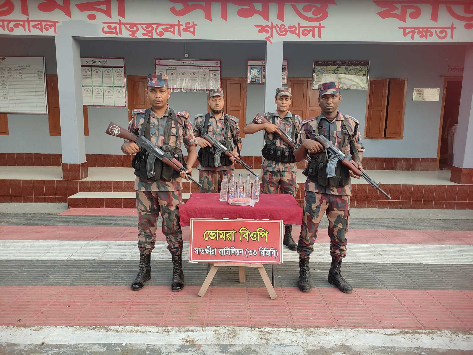 গোয়েন্দা তথ্যের ভিত্তিতে ভোমরা বিওপির পৃথক তিনটি এর আভিযানিক দল মেইন পিলার-২/৩ ও ৫ এস এবং মেইন পিলার-৩ এর ৬ এস হতে ২০০-৩০০ গজ বাংলাদেশের অভ্যন্তরে সাতক্ষীরা সদর থানাধীন ঘোষপাড়া ও লক্ষিদাড়ি নামক স্থান হতে ০৭ বোতল ভারতীয় মদসহ প্রায় ১,১৫,৫০০/- ভারতীয় ঔষধ আটক করে। পদ্মশাখরা বিওপির বিশেষ আভিযানিক দল মেইন পিলার-১ হতে আনুমানিক ১০০০ গজ বাংলাদেশের অভ্যন্তরে সাতক্ষীরা থানাধীন হাড়দ্দা ইছামতি নদির পাড় নামক স্থান হতে ১৩,০০,০০০/- টাকা মূল্যের ভারতীয় ঔষধ আটক করে। তলুইগাছা বিওপির বিশেষ আভিযানিক দল সীমান্ত পিলার-১৩/৩ এস হতে আনুমানিক ২০০ গজ বাংলাদেশের অভ্যন্তরে সাতক্ষীরা সদর থানাধীন চারাবাড়ি নামক স্থান হতে ৭০,০০০/- টাকা মূল্যের ভারতীয় ঔষধ আটক করে। কাকডাঙ্গা বিওপির পৃথক দুইটি বিশেষ আভিযানিক দল সীমান্ত পিলার-১৩/৩ এস এর ৩ ও ৬ আরবি হতে আনুমানিক ৩০০-৪০০ গজ বাংলাদেশের অভ্যন্তরে কলারোয়া থানাধীন গেরাখালি ও কাকডাঙ্গা বলফিল্ড মোড় নামক স্থান হতে ২,৮০,০০০/- টাকা মূল্যের ভারতীয় ঔষধ আটক করে। এছাড়াও, হিজলদী বিওপির পৃথক দুইটি বিশেষ আভিযানিক দল সীমান্ত পিলার-১৩/৩ এস এর ১৪ আরবি ও ১৪/৩ এস হতে আনুমানিক ১০০-২০০ গজ বাংলাদেশের অভ্যন্তরে কলারোয়া থানাধীন বিএসপি পোস্ট ও বড়লী আমতলা নামক স্থান হতে ১,৪০,০০০/- টাকা মূল্যের ভারতীয় ঔষধ আটক করে।সর্বমোট ১৯,০৫,৫০০/- (ঊনিশ লক্ষ পাঁচ হাজার পাঁচশত) টাকা মূল্যের বিভিন্ন চোরাচালানী ও মাদক মালামাল আটক করে।